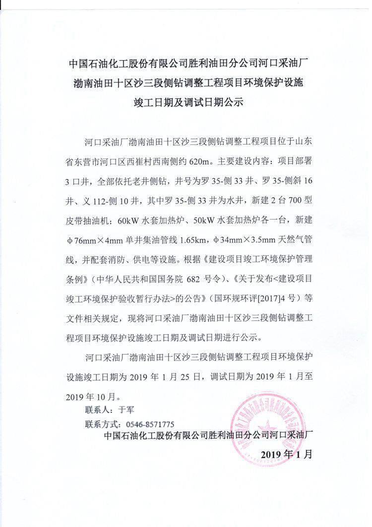 中國石油化工股份有限公司勝利油田分公司河口采油廠渤南油田十區(qū)沙三段側(cè)鉆調(diào)整工程項(xiàng)目環(huán)境保護(hù)設(shè)施竣工日期及調(diào)試日期公示