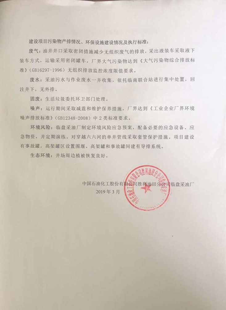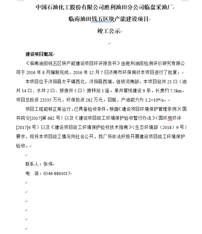 中國石油化工股份有限公司勝利油田分公司臨盤采油廠臨南油田錢五區(qū)塊產(chǎn)能建設(shè)項目竣工公示