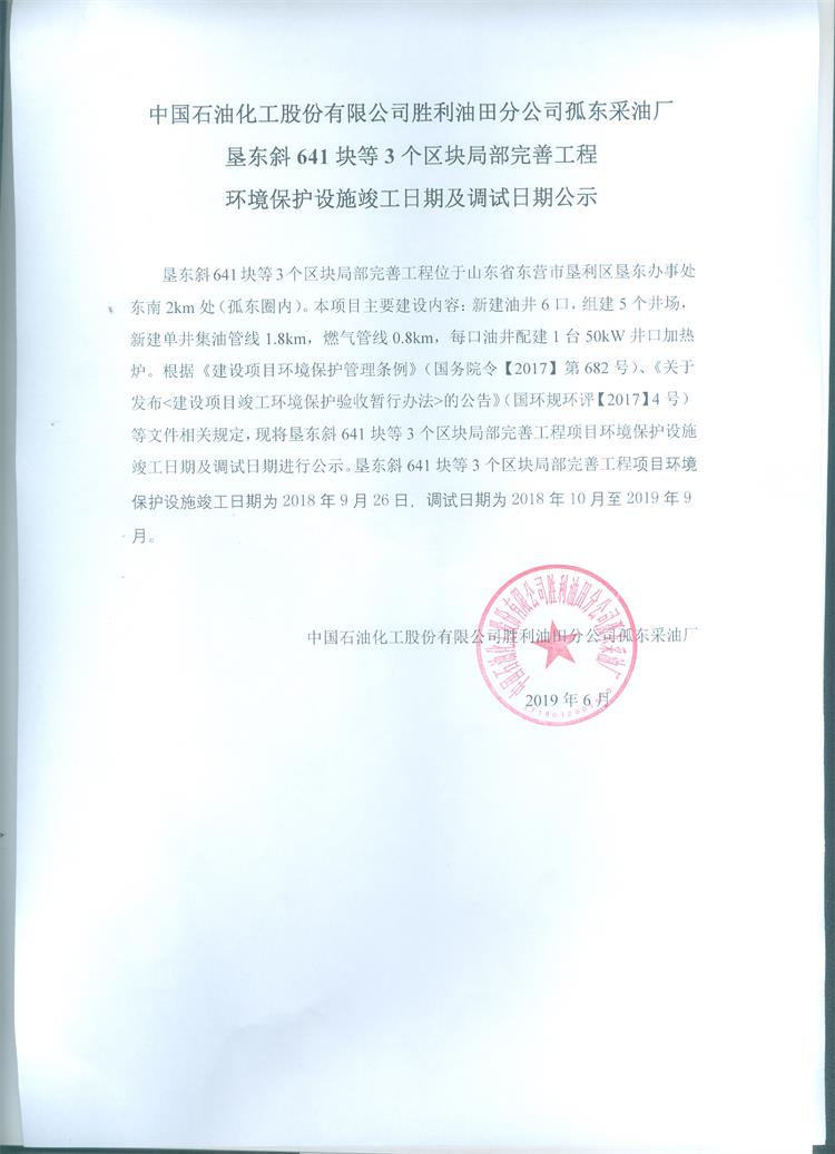 中國(guó)石油化工股份有限公司勝利油田分公司孤東采油廠墾東斜641塊等3個(gè)區(qū)塊局部完善工程環(huán)境保護(hù)設(shè)施竣工日期及調(diào)試日期公示